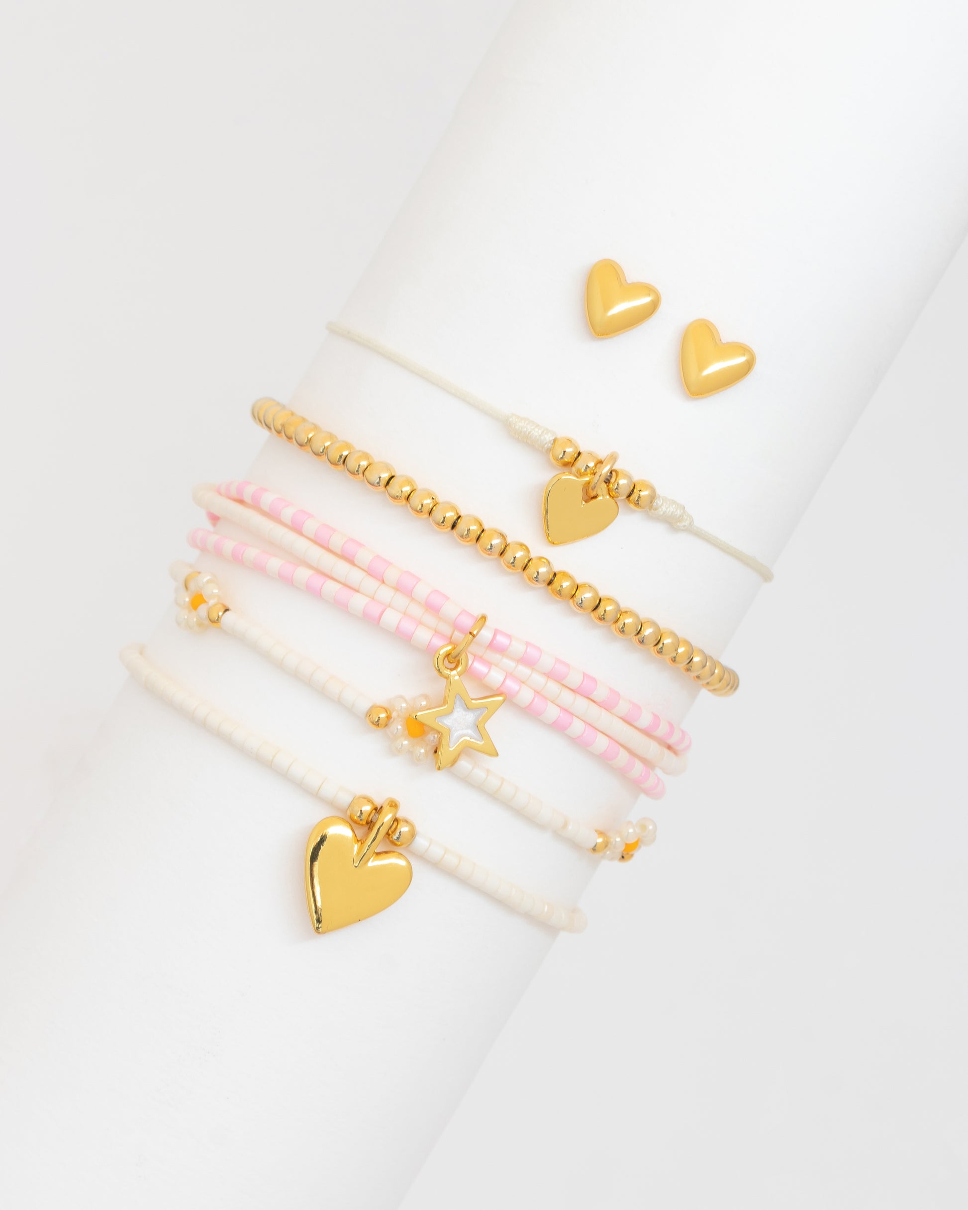 - Incluye: 5 pulseras y 1 par aretes tipo topos (aretes pequeños).